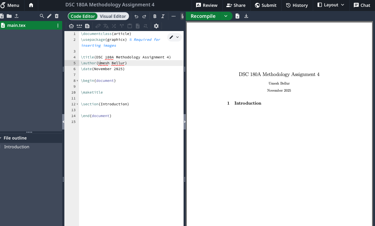 Once you have an Overleaf account, you’ll need to create a new blank project for the Methodology Assignment. To do so, you can go to overleaf.com/projects, click “New Project” in the top left, and then click “Blank Project.” Enter “DSC 180A Methodology Assignment 4” as the project name. You’ll be brought to an environment that looks just like this one: